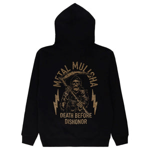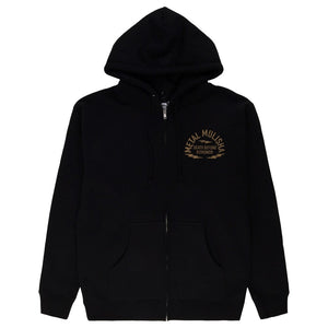 The Massacre Heavyweight Zip Hoodie in Black. This Hoodie features custom screen prints on the front and back in Gold. The heaviest weight fleece we offer, it's built like a tank yet soft and comfortable and has a generous relaxed fit that is true to size.