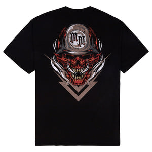 The Razor Tee in Black features a small front hit on the left and a large back hit in Red, Grey and White.
