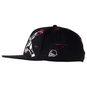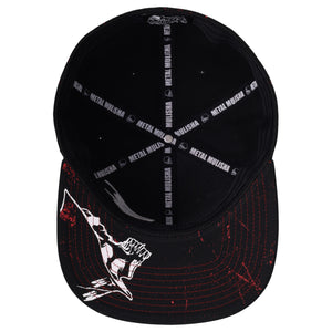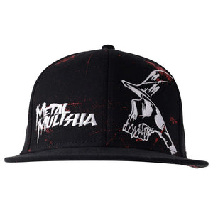The Metal Mulisha Attack Flex Hat in Black features Black with Red splatter printed on all panels with 2 large Metal Mulisha embroideries in White on the front panels, small Metal Mulisha logo embroidery on back center and side, M/M skull underbill print, and custom printed internal seam taping. Flat bill with ability to curve.