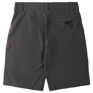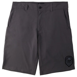 The Metal Mulisha Crooked Hybrid Boardshorts in Charcoal Grey will dominate in & out of the water. With a lightweight, fast drying and slightly stretchy boardshort material they are comfortable and adaptable to anything and look like a regular pair of shorts. Both front pockets have zippers to make sure nothing falls out of the mesh pockets. The back pocket has a zipper pocket. Front zipper fly with a button attached with sturdy nylon...you won't bust buttons off like the ones attached with thread. Internal drawstring to adjust fit without a belt. Front left leg has Chevron logo patch and back pocket has an embroidered M/M 99 emblem. 22" outseam so they are a little longer than you find from most surf brands.