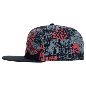 The Metal Mulisha Decade Flex Hat in Black is made with cotton twill fabric and features custom allover print on back 4 panels, large Metal Mulisha Helmet embroidery on wearer's front left panel with allover printed applique fill, red M/M embroidery on wearer's front right panel, matching allover print undervisor, back center Metal Mulisha embroidery, custom printed internal seam taping, and new comfort sweatband. Flat bill with ability to curve.