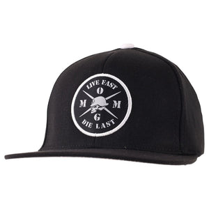 The Metal Mulisha Die Last Flex Hat in black features a woven label patch on front center that is secured by white edge embroidery, small Metal Mulisha logo embroidery on back center, small M/M underbill print, and custom printed internal seam taping. 87% Acrylic / 11% Wool / 2% Spandex