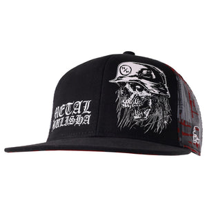 The Metal Mulisha Mayhem Flex Hat in Black features a custom skull art screenprint on the wearer's front left panel and an old english style Metal Mulisha embroidery on the front right panel, small Metal Mulisha logo embroidery on back center and small helmet embroidery on left side, dark red/maroon back panels covered in black and grey all over screen print, large M/M underbill print, and custom printed internal seam taping. Flat bill with ability to curve.