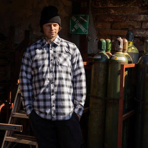 The One Shot Woven Long Sleeve Plaid Shirt features custom Metal Mulisha buttons, Metal Mulisha woven label on front left pocket, and a back Metal Mulisha woven label. 60% Cotton / 40% Polyester